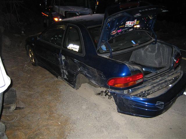 As several of you already know, a kid in a 2001 Outback sideswiped me on SR 431 tonight. The car is almost certainly totalled, the left real wheel and strut were ripped off, and the quarterpanel area is hammered. the driver's side door and fender are damaged too. I'm okay, no real inuries, just a little bruising. Pics will be up later tonight.