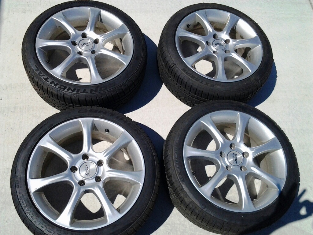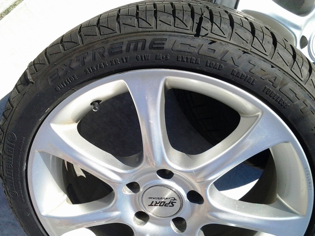 The tires are 215/45/17, and only have 750 miles on them. They are brand new and are mounted on a set of 17" "sport edition" steel wheels. The lug pattern is 5x114, I'm not sure of the offset but I bought them from Subaru for my 06 STi so it's probably +48.