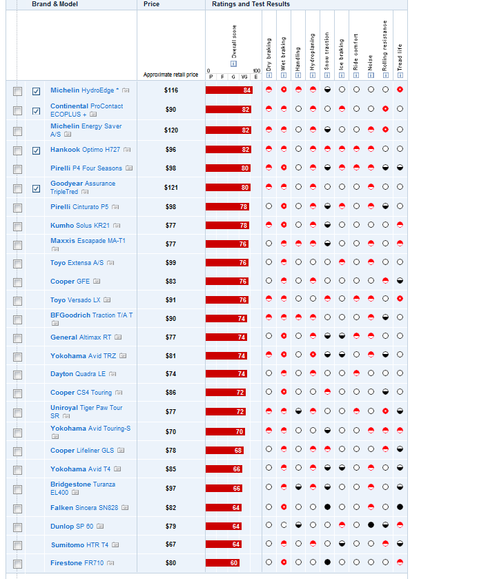 I would avoid anything with even a half black circle in hydroplaning in the CR list!!! If you can't move water out from under the tread, you sure as hell can't move Sierra Slushdge!