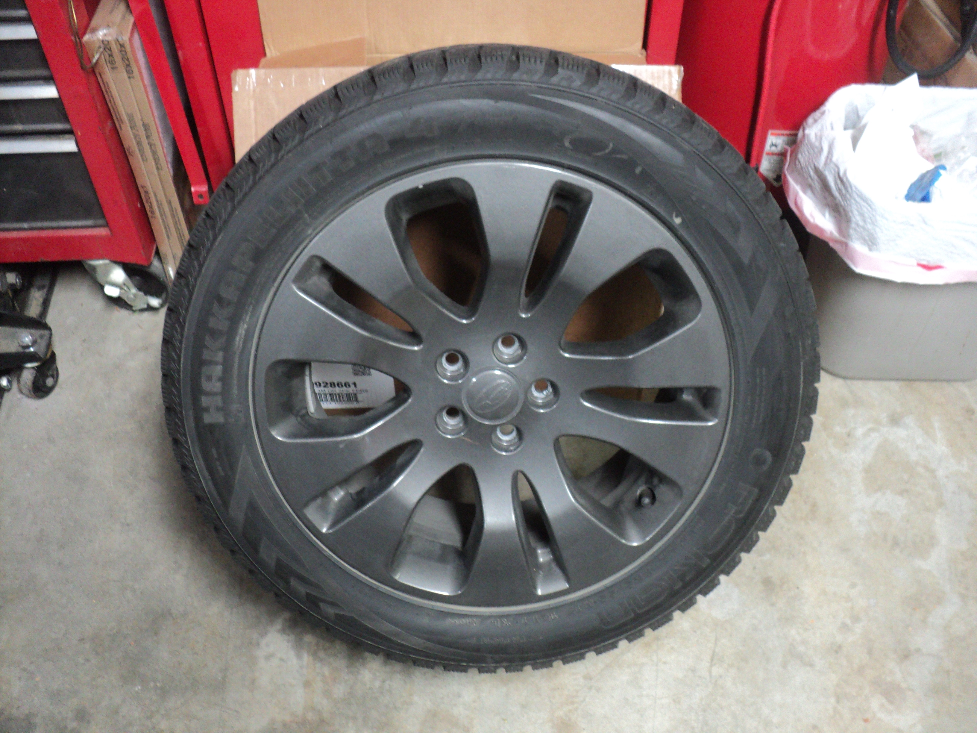 I bought these wheels from Scott, they were from his Outback XT I believe. Pretty sure they are 17x7 ET48. I painted them gray, they have a couple of small chips but are in pretty good shape. They are the same wheel that comes on the newer Impreza Sport models. I only used them last winter, then over the summer I put on the 4 pot calipers and now these don't clear. So I need to sell them and get something that clears 4 pots. I can sell with or without the tires, preferably with so I can shop for 16" or 17" wheel options. Tires are Nokian Hakka 4, no studs but they are studdable. 2 have 9/32" and 2 have 7/32", they are 225/55/17. Great winter tires, I had no problems last year on them.