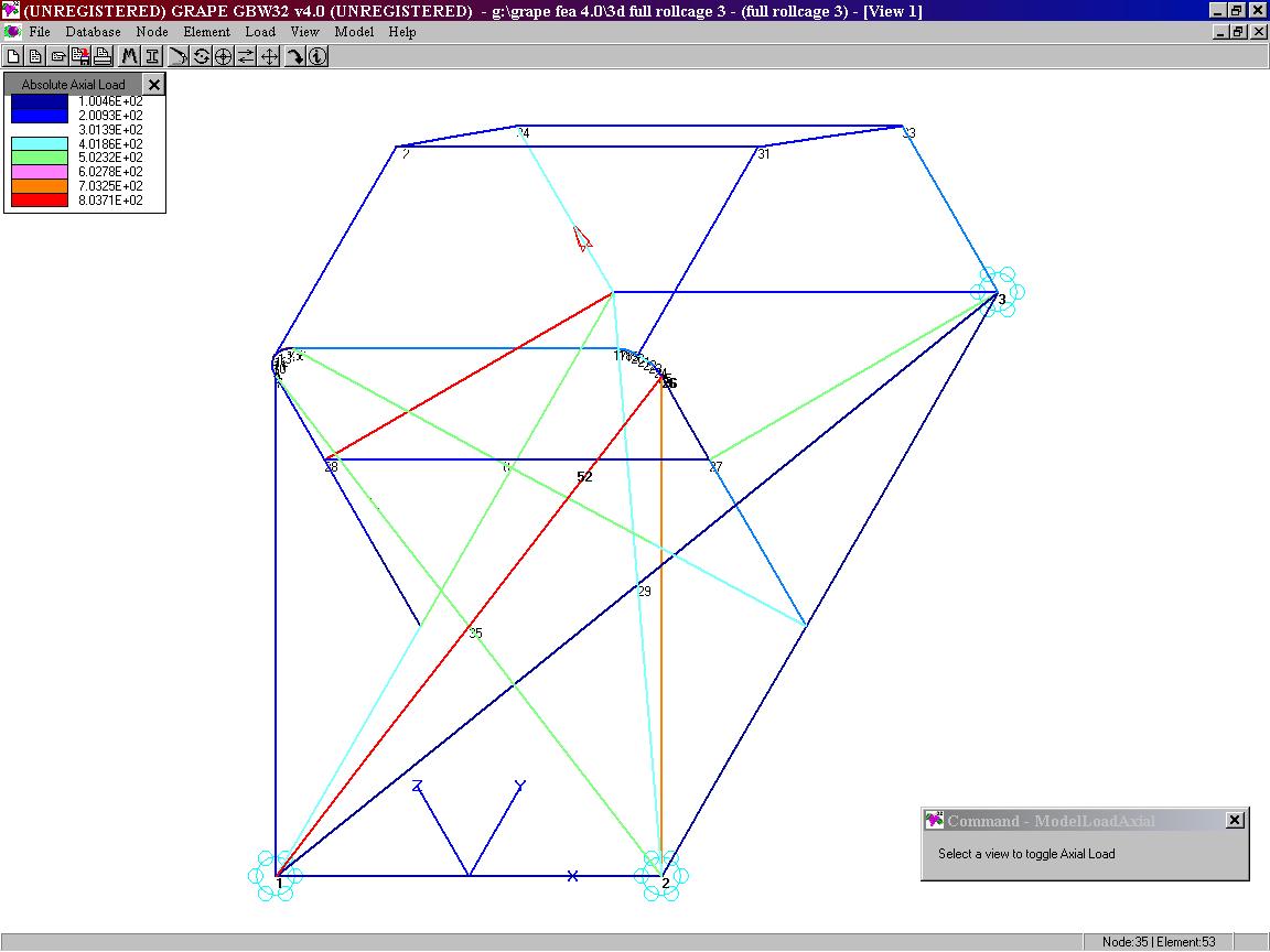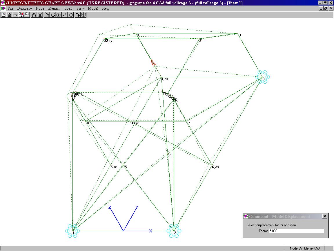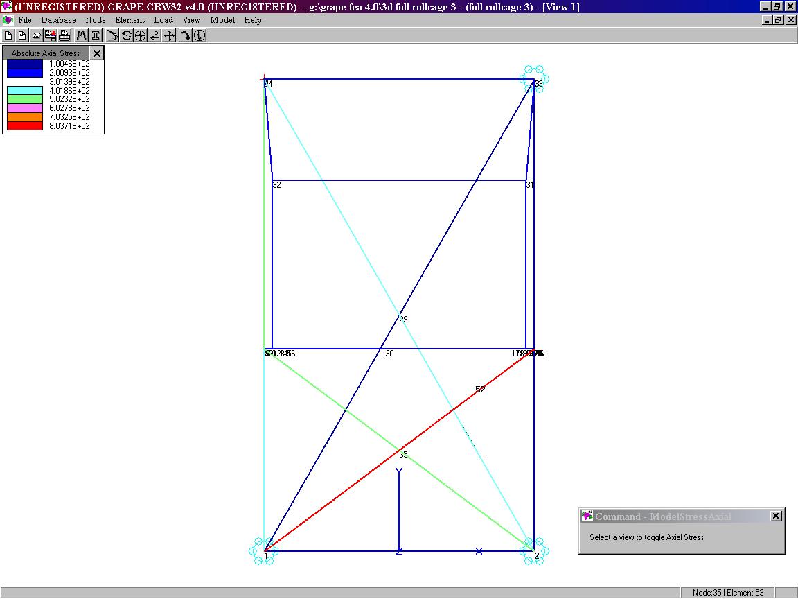 Check it out; I've been playing around with rollcage models in a FEA program, and it's pretty sweet. You can apply loads to the structure and not only see stress levels in all the tubes, but it calculates displacement - so you can see how the cage will flex under your given load as you add & subtract different bars from the structure. It can even animate it for you.