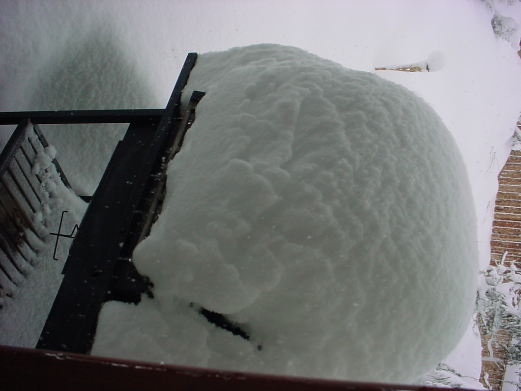 This snow today is amazing...It could be more than the last big storm, but I can't be sure. My patio cover is about to buckle from the weight, ( I think the lattis(sp?) is going to break through only, no big deal. You can see the depth of the snow on my 5' tall tiki torches.