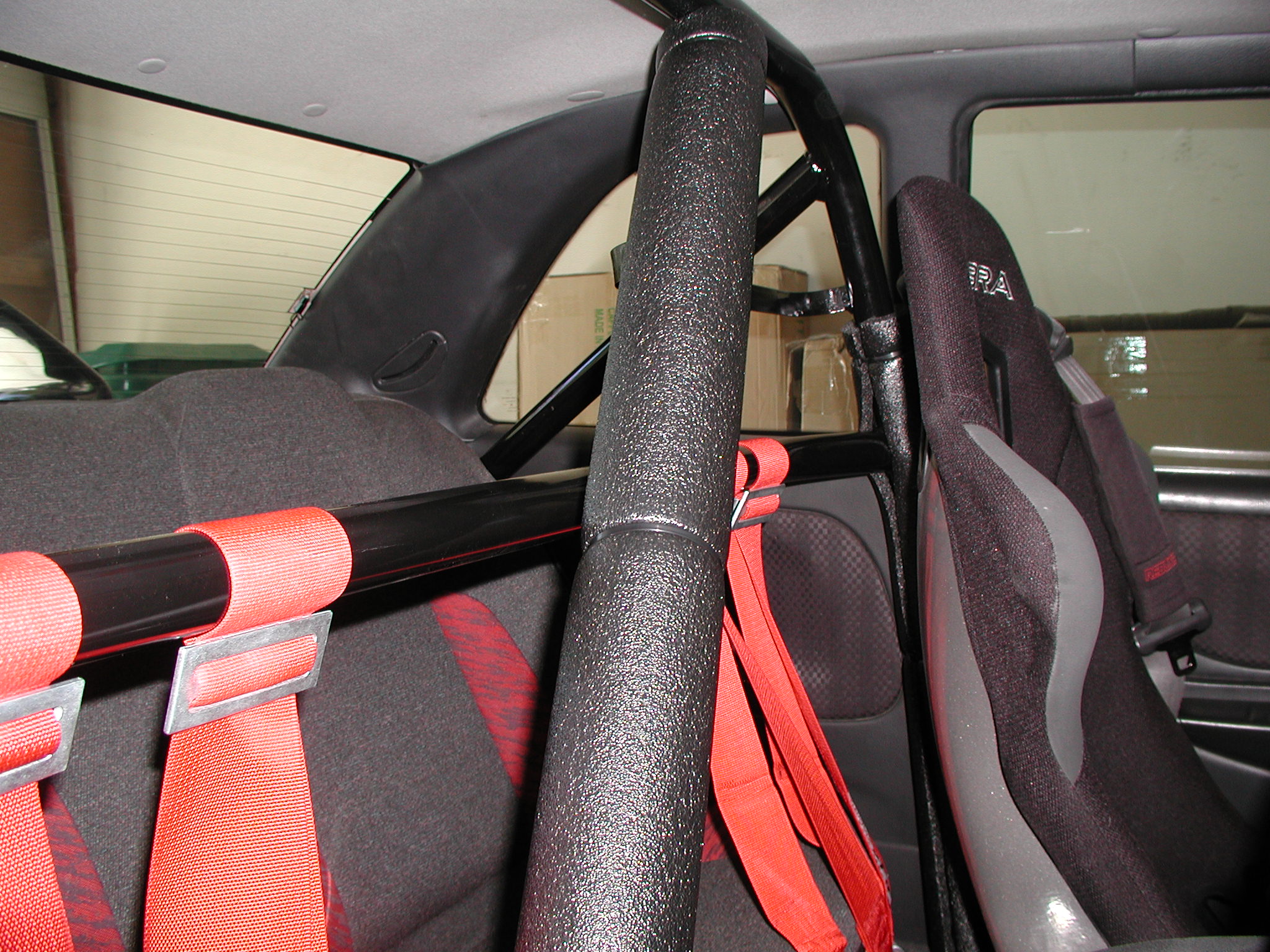 It took us a couple hours to install. I plan on getting some of the "better" high density padding from Summit asap, but I don't get paid until this afternoon... The top bar is farther away from your head in the seated position than it looks in the pics, but still... I just put the rear seat in for sound deadening more than anything. I drove that sucker to Sac once with the rear seat out, and wanted to shoot myself by the time I got to Gold Ranch!
