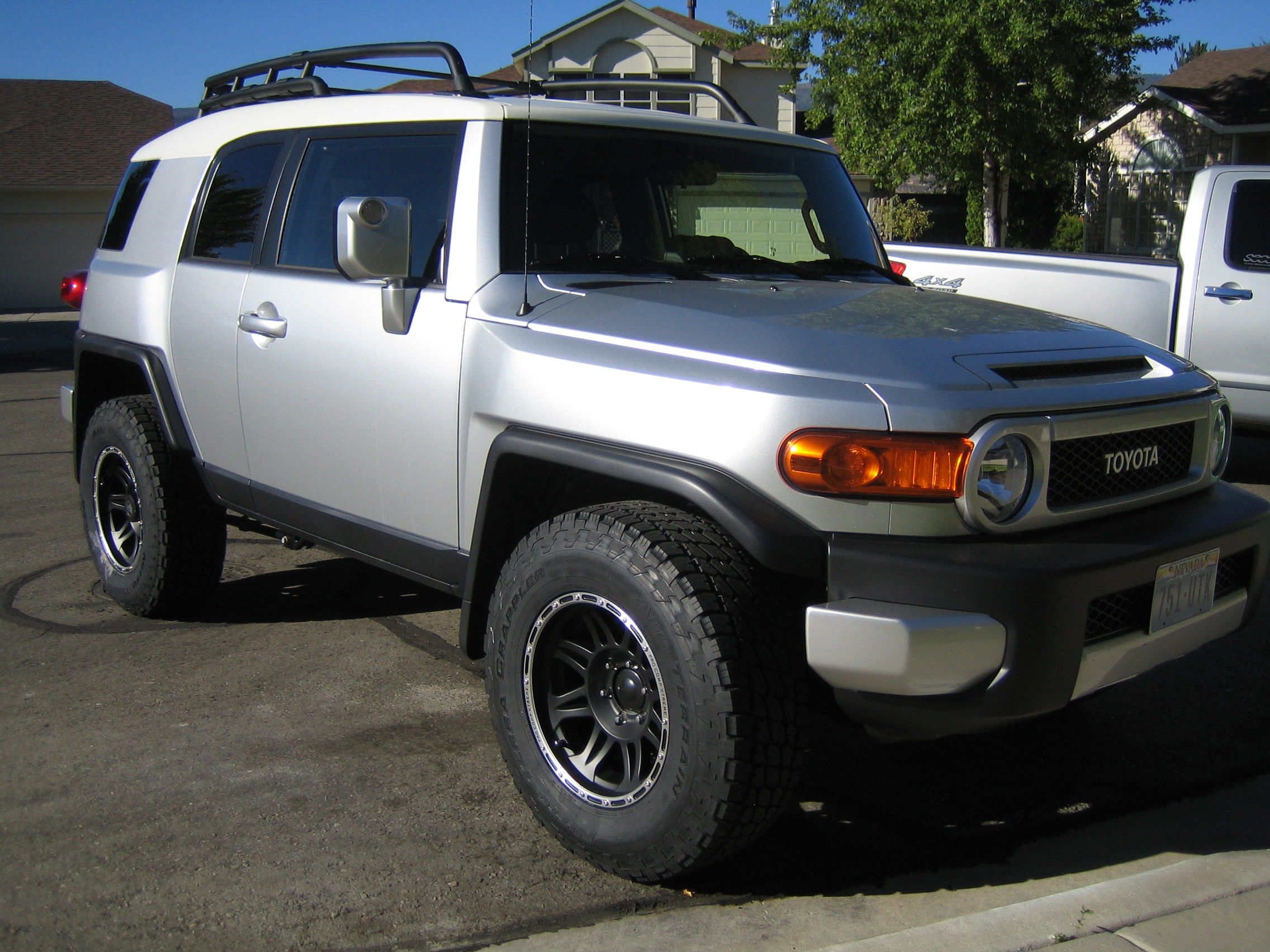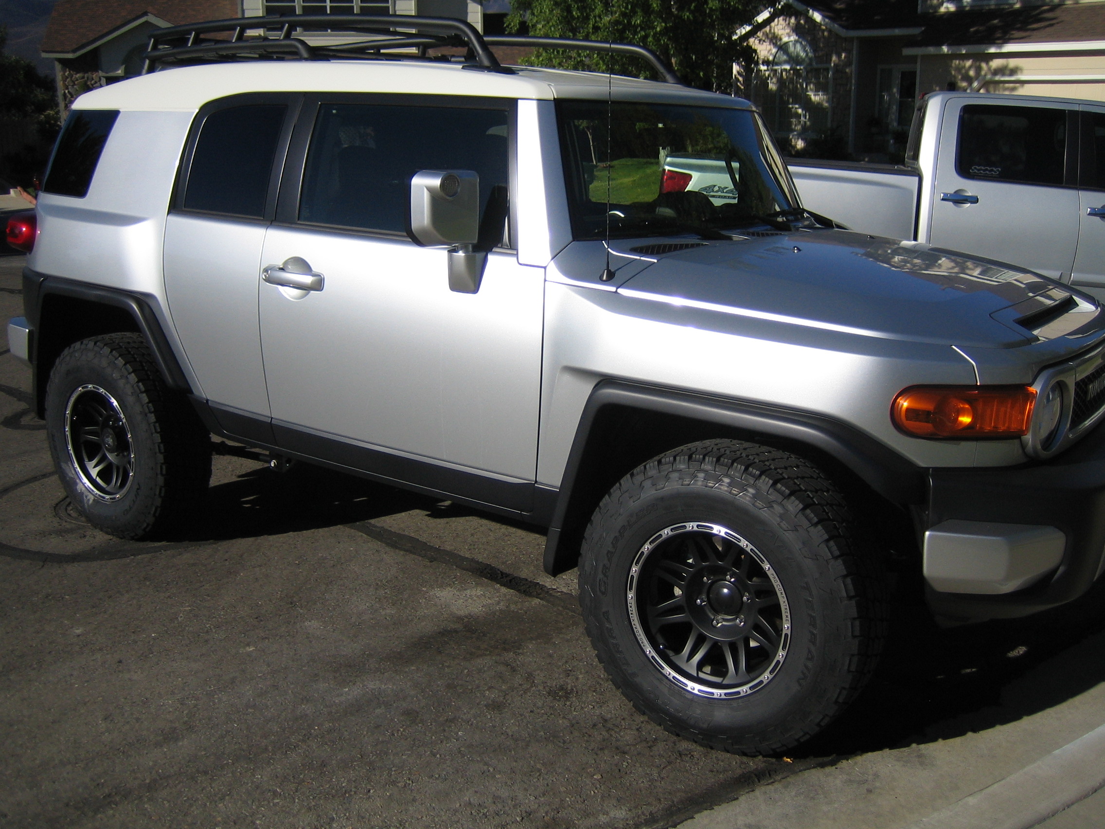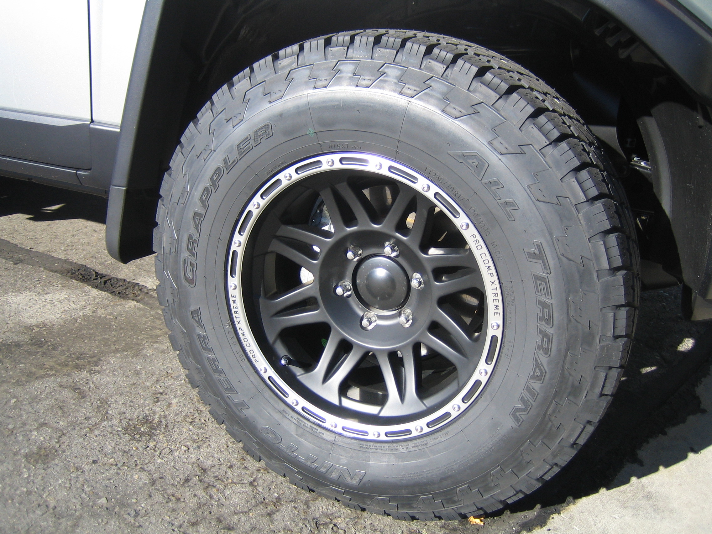 I picked up my new FJ on July 29, my birthday present to myself. Anyway, I love this thing, I put my new rims and tires on it last night. 17 x 9 (-6) Pro Comp 7015 Wheels with Nitto terra Grappler Tires in a 285-70-17 (33x 12.5). My 2" lift is on the way, I hope to install that on Sunday. Anyway, check it out.