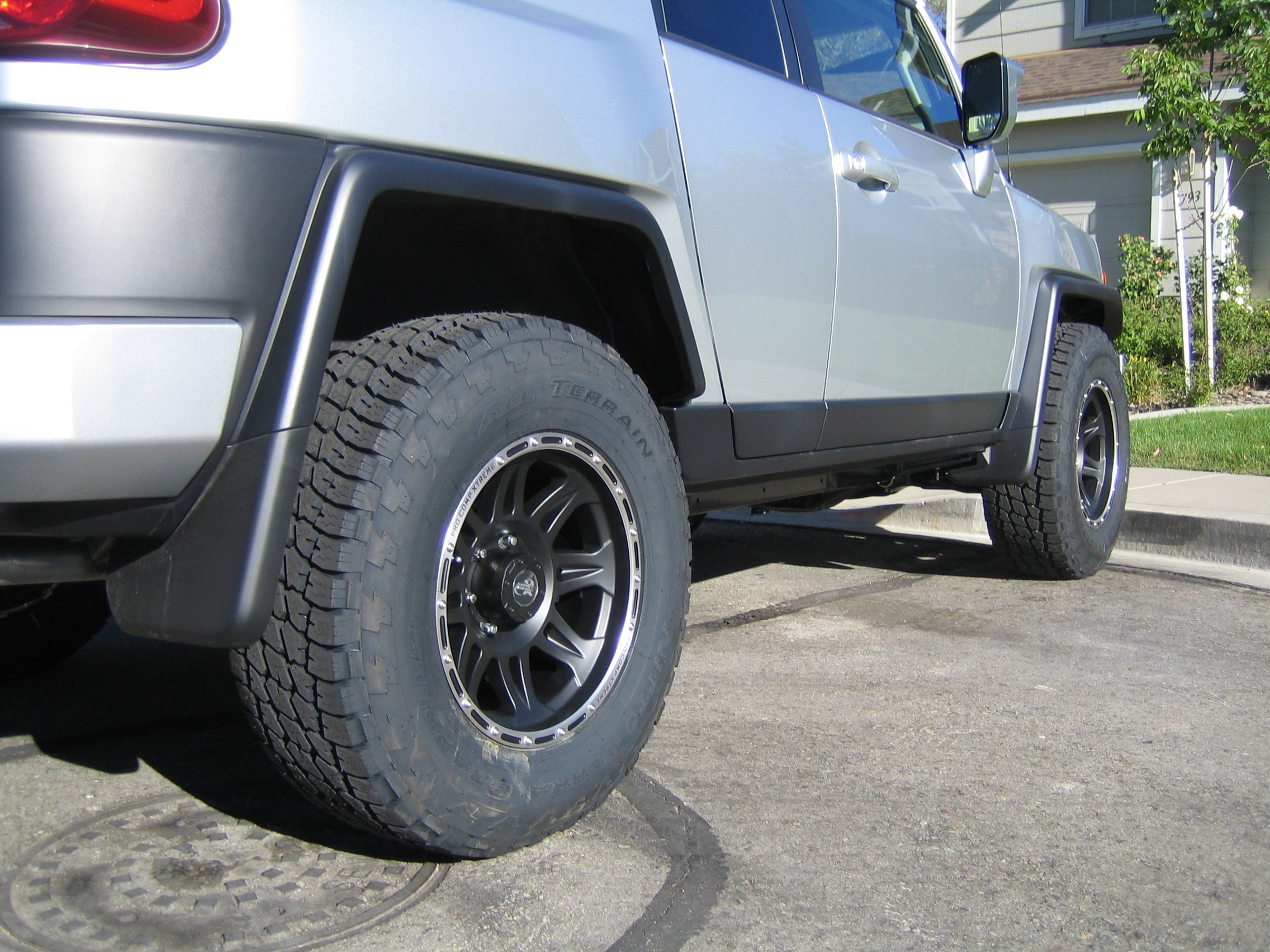 I picked up my new FJ on July 29, my birthday present to myself. Anyway, I love this thing, I put my new rims and tires on it last night. 17 x 9 (-6) Pro Comp 7015 Wheels with Nitto terra Grappler Tires in a 285-70-17 (33x 12.5). My 2" lift is on the way, I hope to install that on Sunday. Anyway, check it out.