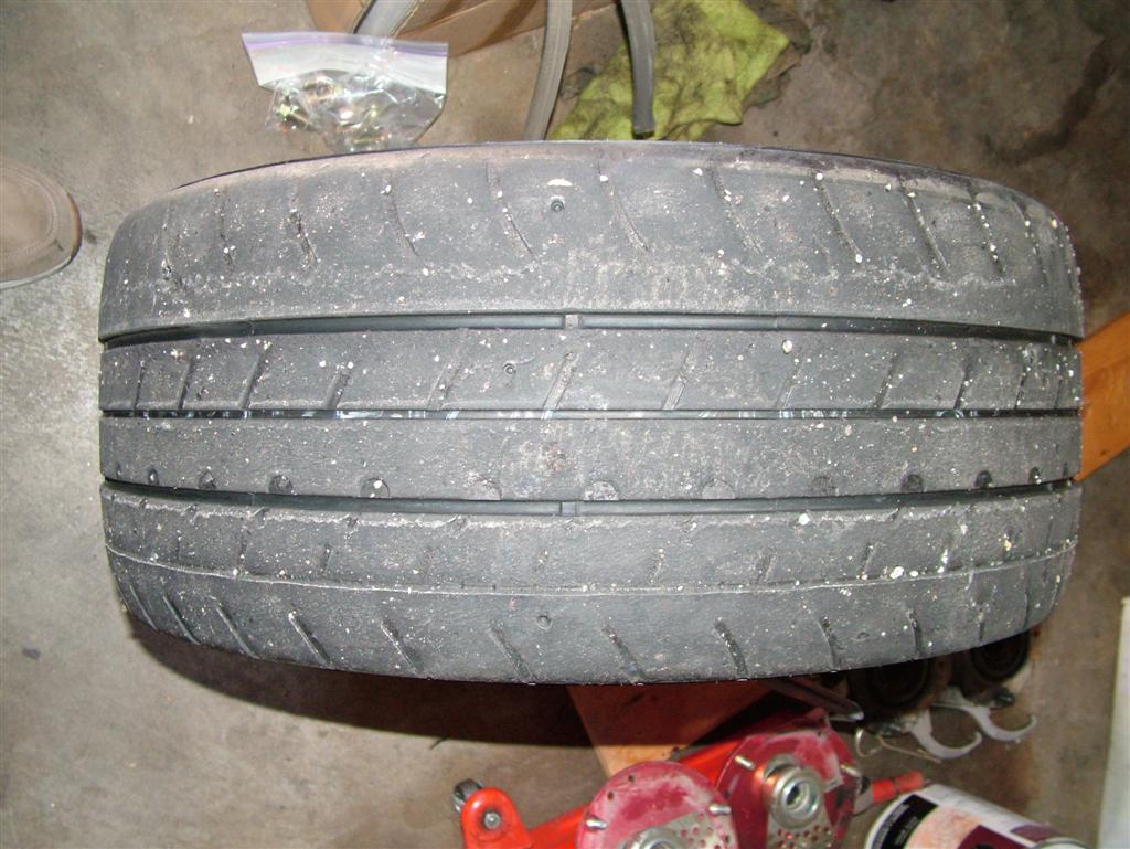 They stick very well. About the only cars faster in the corners were on Hoosiers and had coilovers or were full race cars. OK, teh driver may have something to do with it. I plan on buying a couple more sets to burn up. 235s clear the '04 STI rear fenders with stock strut and alignment on 17x8et45 wheels, but just barely. (Rubber strip removed) Here are some pictures. As you can see from the build up, they were warm
