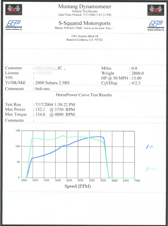 Car: 2000 2.5RS Mods: Cobb Tuning CAI, Mr. Josh LW Pulley, Exedy Clutch & Lightweight flywheel, MRT headers & cat, Greddy EVO catback Wheel HP: 132.1 @ 5750 RPM Wheel Torque: 134.6 @ 4000 RPM Dyno: Mustang @ S-Squared Motorsports 17 July 2004