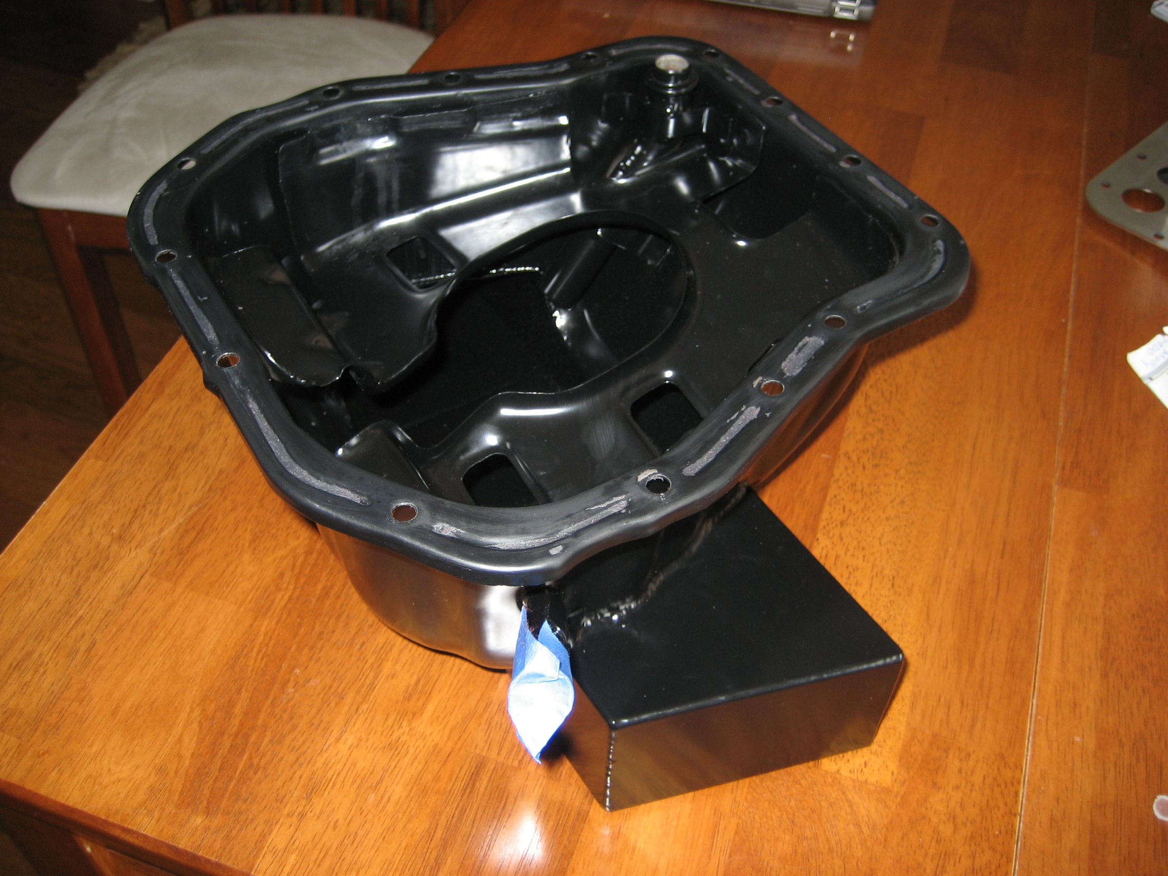 It's basically a normal STi pan with a big ol' box added to it. The pick up is extended about .5" to get down in there. I'll get some better pictures of it and the cosworth baffle when I pull it off to redo the gasket.