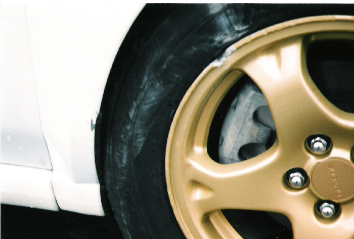 i dont know what is up with subies hitting curbs, but one attacked my car today and put it out of commision. i was getting it washed, and the load off car washer was pulling it out of the tunnel and decided he wanted to get on it..well i guess he couldnt handle it and smashed straight into a curb smashing my rs rim breaking my front suspension and shoving the wheel into the quarter panel. i had it towed today and the car wash is fully responsable.