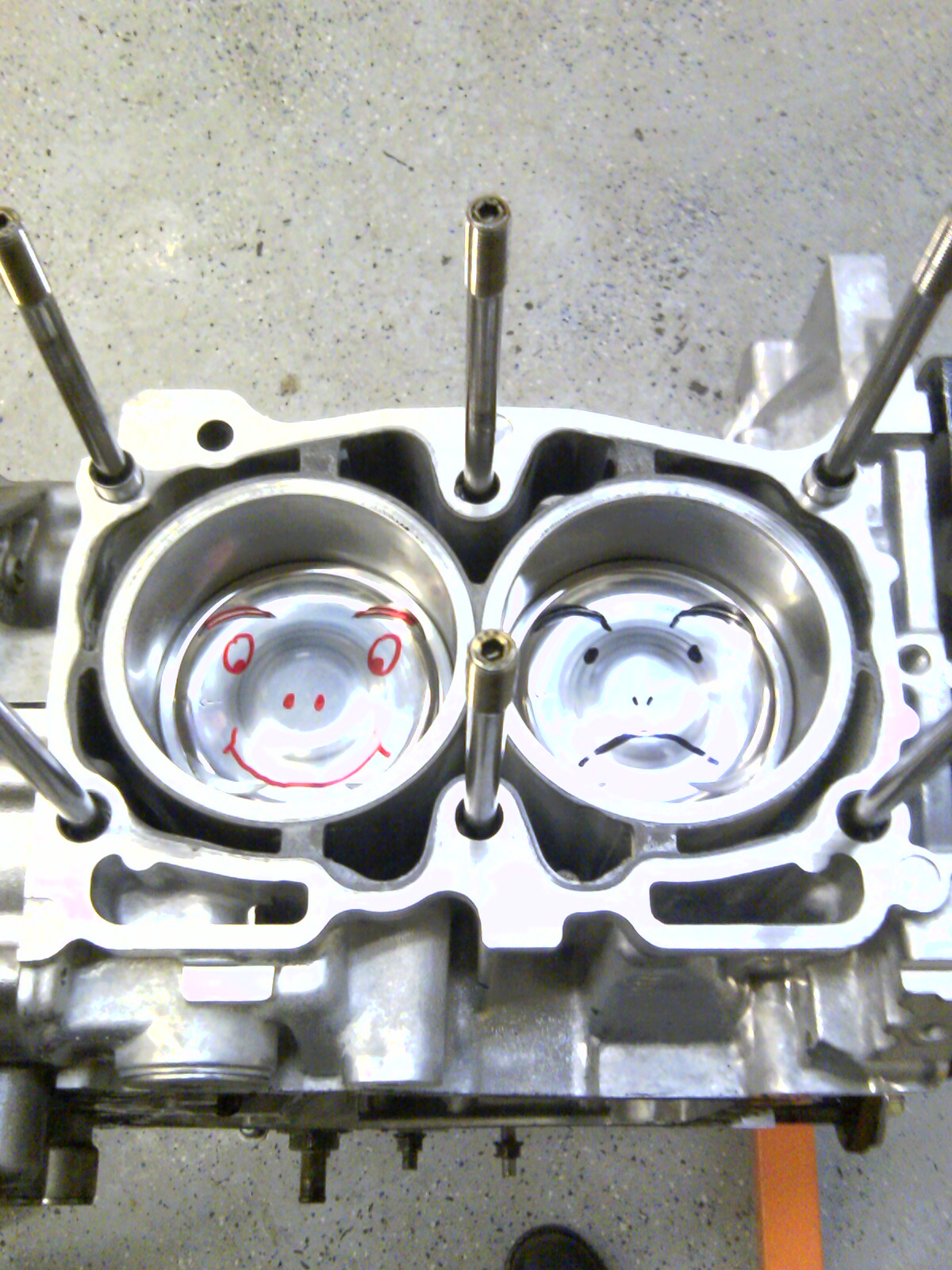 Message relayed! Cory had already fixed the cross threaded bolt actually, and the heads are stripped down for assembly. Your shortblock might be done by lunch.