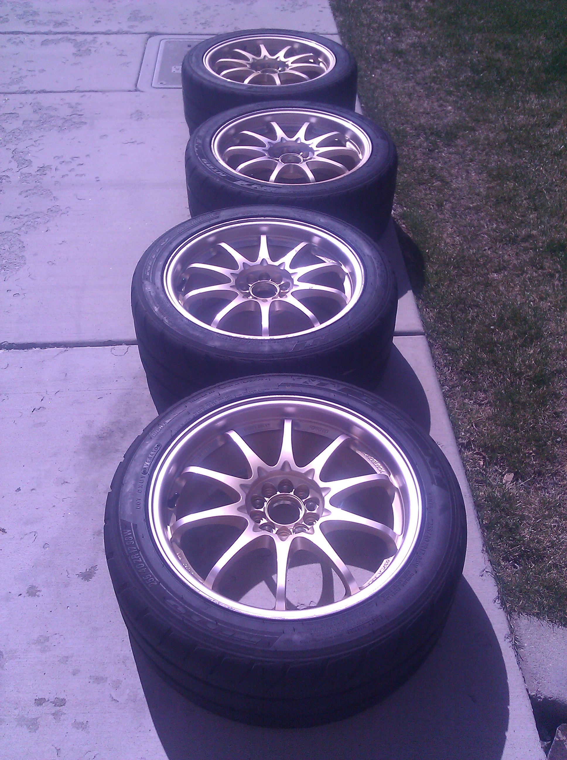My time in Reno will soon be coming to an end, and thus I will be selling my Subaru and all related accessories. First up is a set of gold Volk CE-28N wheels with Nitto NT05 street tires. The wheels are 17 x 8.5, 5x100, +44 offset and weigh around 14 lbs each. They used and show signs of wear and tear, but ultimately they are round and balance without issue (tires were mounted by KSpeed last summer). I also have the Volk aluminum hub centric rings (56.1cm) to allow for perfect centering of the wheel on the hub. Tires are 255/40/17 (http://www.nittotire.com/Tire/nt05) and have literally less than 300 miles on them. I was planning on using them for autox last season, but as some may know those dreams didn't last long once my transmission blew at the first event. Once I had everything put back together, the season was basically over and these just ended up sitting in my garage. Volk carbon center caps will be included with the sale.