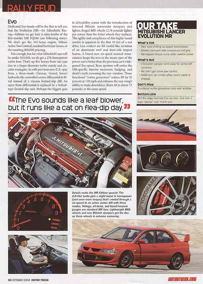 New article about the '05 STi and the new EVO VIII MR. I didn't realize the STI's lost so much power from the engine to the wheels, the EVO actually makes more HP to the wheels than the STI. Good article...