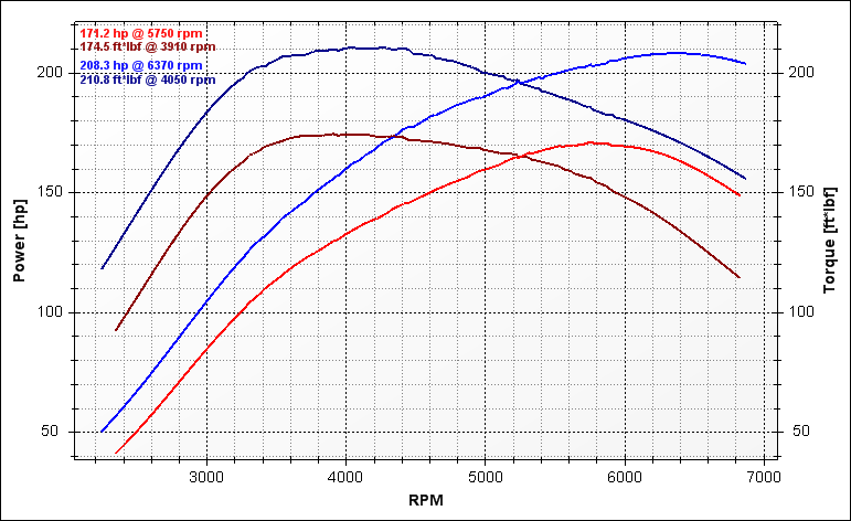 Car: 2003 WRX Wagon Mods: Crucial UP & DP, Borla Hush CBE, K&N Drop-In, Heat Wrapped Stock Headers (3rd Cat remains), Intake Silencer Delete, Omori Boost & EGT Gauges, Cobb Protuned by Equilibrium Tuning Wheel HP: 208.3 @ 6370 RPM Wheel Tq: 210.8 @ 4050 RPM Dyno: Equilibrium Tuning Road Dyno (very comparable to the Gruppe-S Mustang Dyno) Ed of Equilibrium Tuning road tuned my car with Cobb Protune. It was a low 90’s degree day in Davis and the roads were practically baron. We started by taking a baseline pull. Ed commented that my car’s Advanced Multiplier was only at 7 out of 16 so he wasn’t surprised when my car only put down stock-like numbers despite my mods. He then loaded a base map he had made and we returned to the road dyno. The car came alive like it never had before. The map was damn good from the get go and only got better over the course of the next few hours as he fine tuned it. We did about 10 3rd gear pulls and a couple 1st through 3rd gear pulls and 1 shift to 4th gear. I was surprised how much power the car was making. Ed was surprised how fast my car hit target boost (a hair over 17 PSI). It was a whole new car. No more stepping on it and waiting for the turbo to spool up. Some people have been replacing the OEM boost solenoids with an inexpensive GM one that helps response. The stocker often has a hard time getting to the top couple PSI. My car didn’t have this problem. Ed said it acted like it had a MBC. This was the first time Ed has ever tuned a car with Crucial pipes and we think that could explain the better than normal boost response. It was incredible how fast the boost needle would swing to 17 and just stop on a dime every time. He said twin dump DP’s are much easier to tune for than bellmouth. But even taking that into consideration, he was very impressed with my boost response. I think the ceramic coating and streamline design are what make all the difference. Thank you Crucial and thank you Ed! You both get 10 out of 10. Here's my before and after graphs, overlayed for comparison.