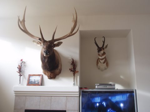 Anyway I didn't pay too much attention until he showed up this week with the stuffed head in the back of his truck. This thing was huge! I told him to take a photo of it and send it to me so that I could post it here. The room has 10' ceilings, and the top of the horn is about 2 inches below the ceiling. BTW his wife has given him 1 week to get it out of her house |