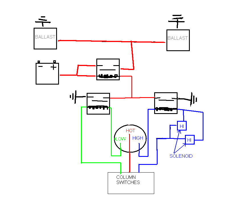 When the LOW is switched to ground, the ballasts get fused power from the battery. When the HI is switched to ground, the shield solenoids are activated, as well as the right hand relays, which in turn grounds the relays that are powering the ballasts.