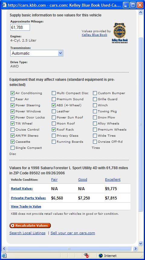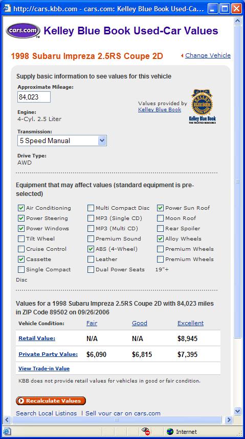 Regardless of what KBB thinks, an equivalent year, mileage, and equipment RS will sell for more than a forester. Just check listings on nasioc and rs25- you won't find an RS that's asking much less than retail. Same thing on the classified sites like cars.com and autotrader.com. And dealers are pricing 2000/2001 RS higher than some bugeye WRXs.