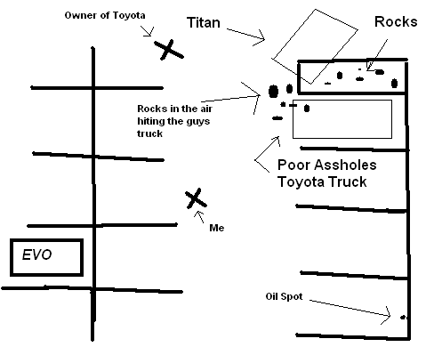 I was at the bestbuy parking lot in SpanSprings and this girl driving a Titan is leaving the parking lot. She cuts the corner way too much and decides she should keep going even though her back wheels are resting not so firmly on boulders and rocks 4"-6" large ones.