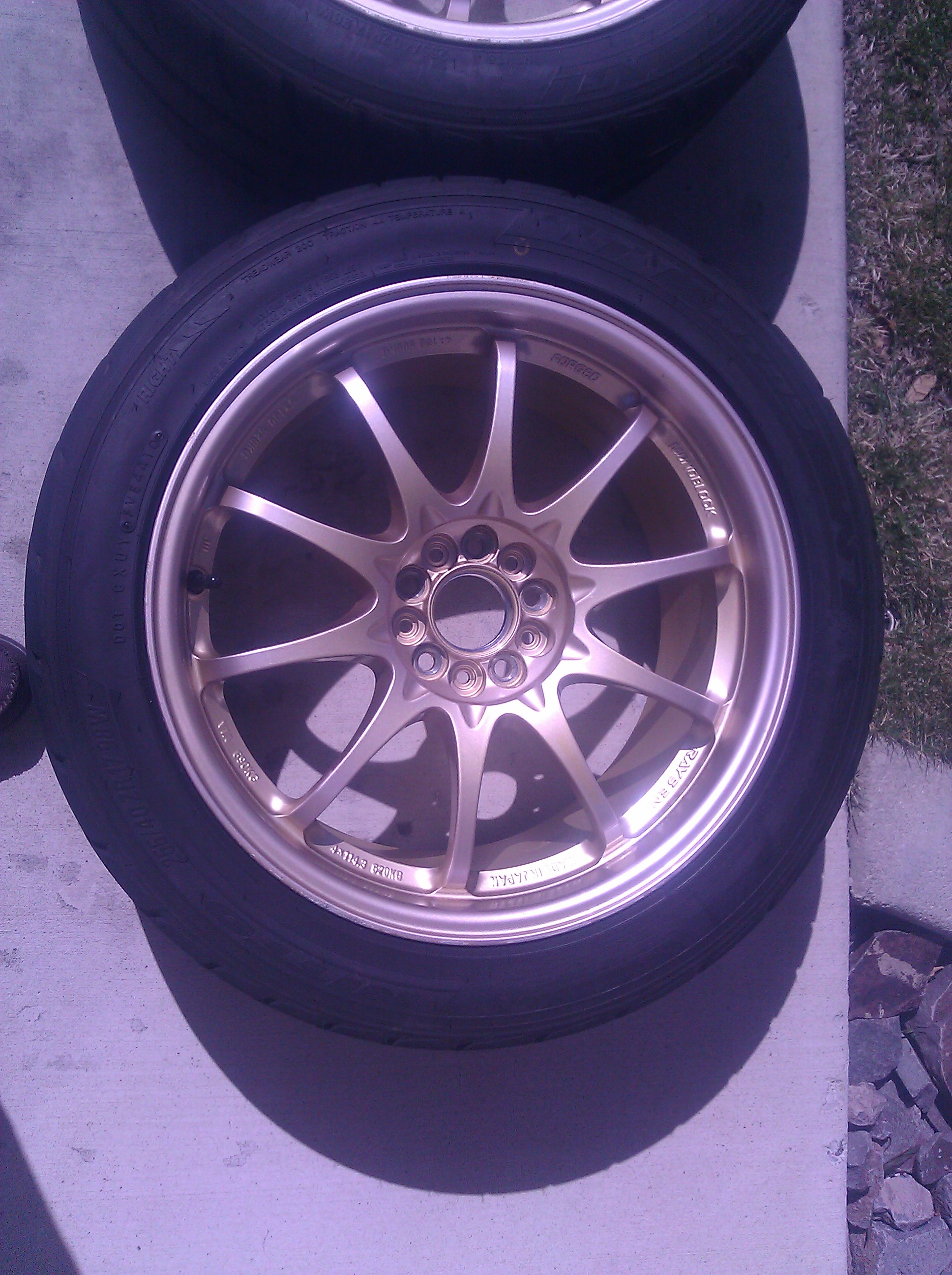 My time in Reno will soon be coming to an end, and thus I will be selling my Subaru and all related accessories. First up is a set of gold Volk CE-28N wheels with Nitto NT05 street tires. The wheels are 17 x 8.5, 5x100, +44 offset and weigh around 14 lbs each. They used and show signs of wear and tear, but ultimately they are round and balance without issue (tires were mounted by KSpeed last summer). I also have the Volk aluminum hub centric rings (56.1cm) to allow for perfect centering of the wheel on the hub. Tires are 255/40/17 (http://www.nittotire.com/Tire/nt05) and have literally less than 300 miles on them. I was planning on using them for autox last season, but as some may know those dreams didn't last long once my transmission blew at the first event. Once I had everything put back together, the season was basically over and these just ended up sitting in my garage. Volk carbon center caps will be included with the sale.