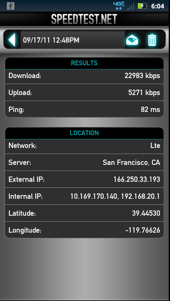 I'm pretty impressed with the Motorola Bionic and more so with the Verizon Wireless 4G around here. $30 data plan for 2Gigs but for me that's plenty for daily phone use. I think I was just at the right place and right time when I recorded the speed. But average around Reno was 16 - 18 Mbps D/L, 5Mbps U/L. Just thought I'd share.