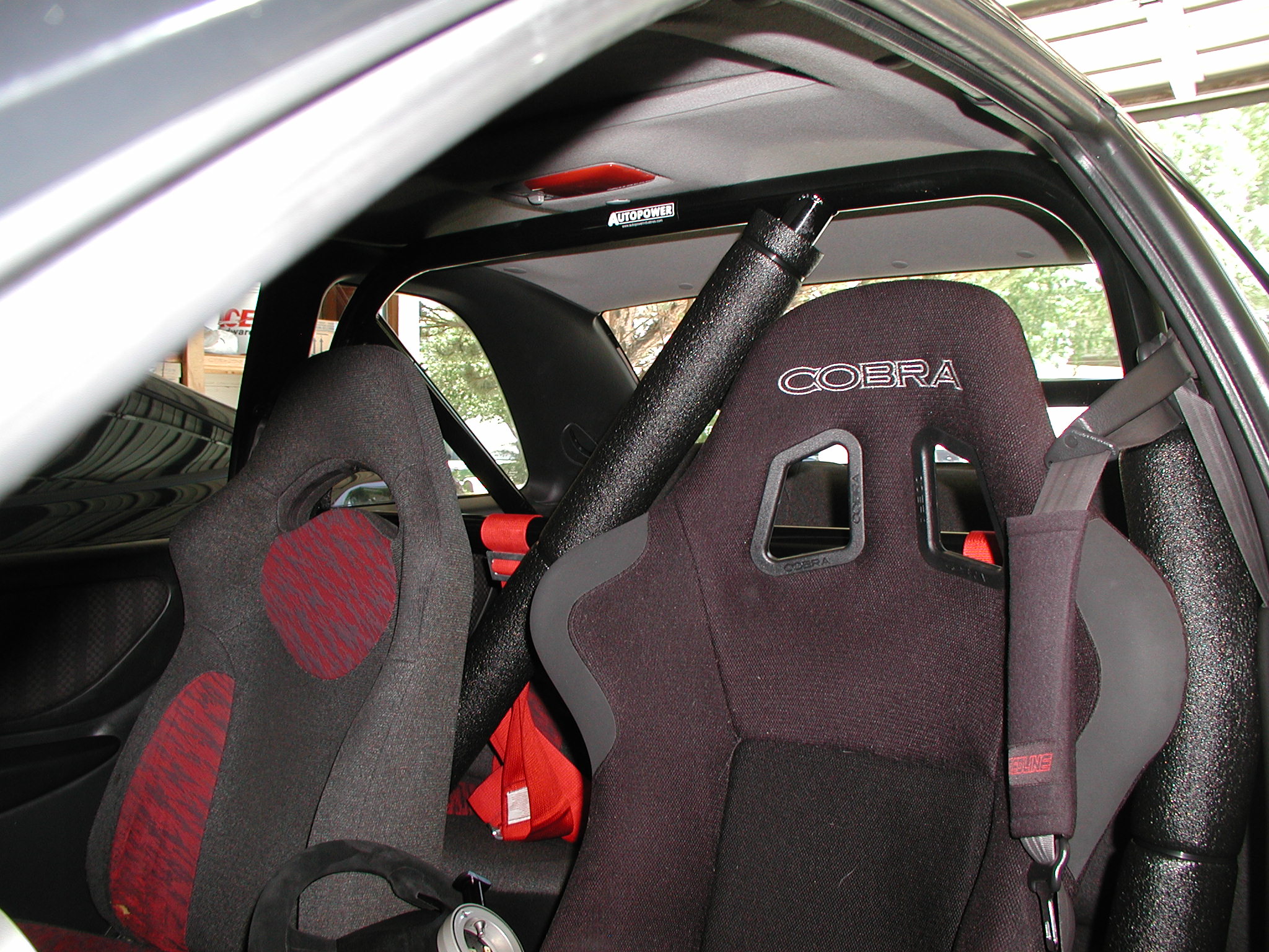 It took us a couple hours to install. I plan on getting some of the "better" high density padding from Summit asap, but I don't get paid until this afternoon... The top bar is farther away from your head in the seated position than it looks in the pics, but still... I just put the rear seat in for sound deadening more than anything. I drove that sucker to Sac once with the rear seat out, and wanted to shoot myself by the time I got to Gold Ranch!