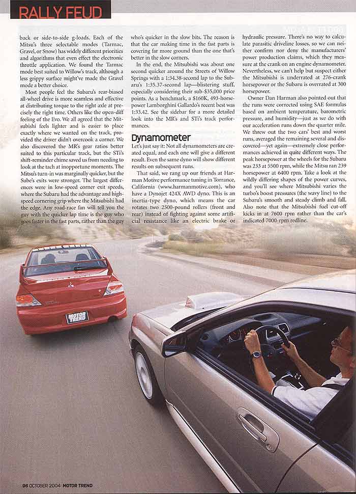 Yeah, the Evo MR has a turbo that's bigger than the STi's actually. With the large turbo and smaller motor, it will always make more dyno horsepower without really being faster in a straight line. It's because of the way horsepower is calculated.