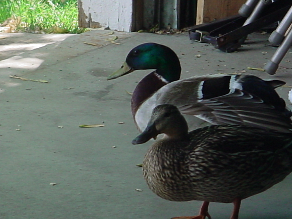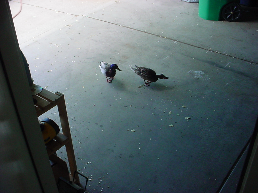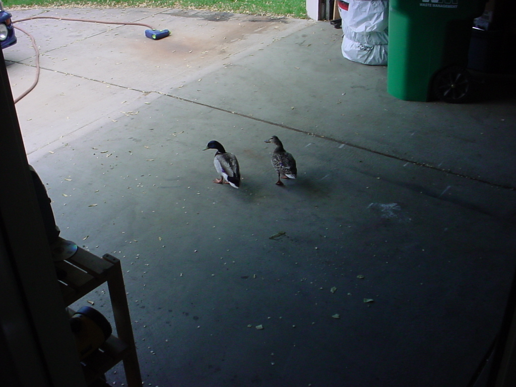 So apparently, our cul-de-sac has been adopted by a pair of ducks as a new home. They hang out on our lawns, bathe in the sprinklers, and generally act like they belong here. today, while I was getting ready to wash my car, they even walked into the garage and looked at me kind of expectantly. So I fed them some Tostitos. We didn't have any bread.