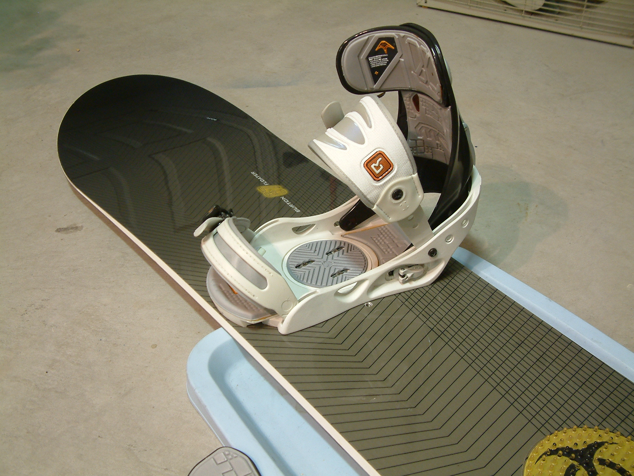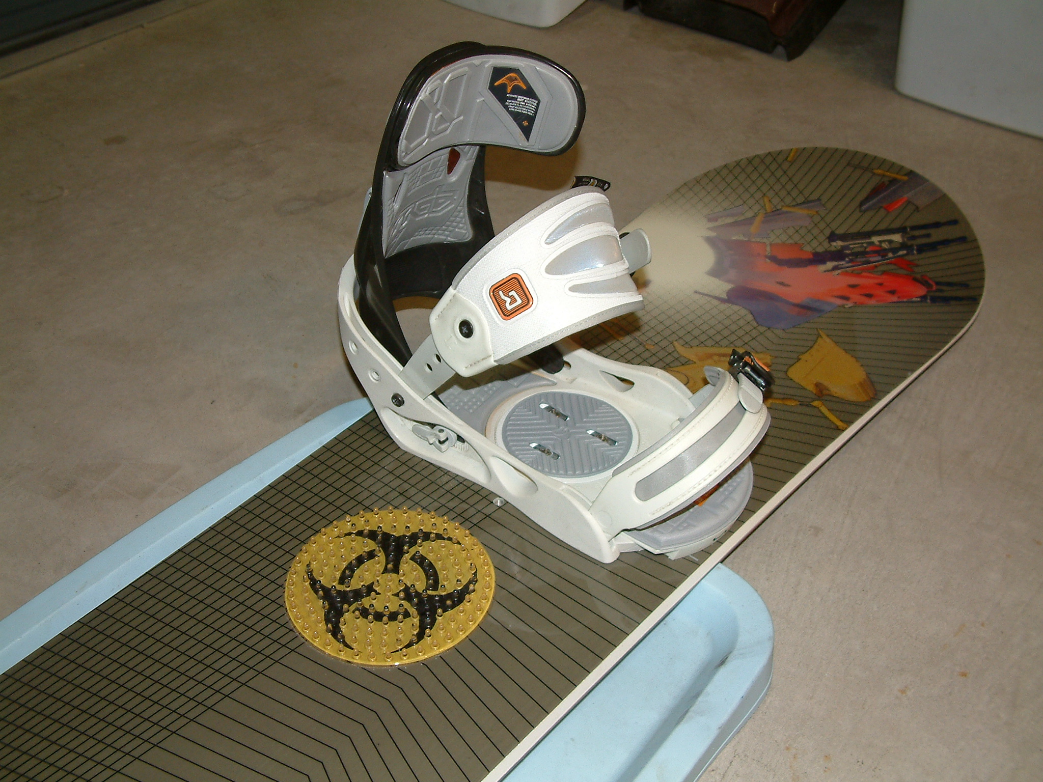The board's a 2002 Burton Floater 167. It's a great free-ride board for tall people w/ big feet. The board is damn near new. I think it's been ridden like 8 times, all in good snow, so no rock damage or anything. Plus, I totally suck at snowboarding, so it's not like I've been jumping it off anything or sliding rails. The board has some nice Burton bindings as well, but I can't remember the name of 'em. The bindings have both the wrap-around pads (installed) and the regular ones (on the floor in the pics). I'm looking for $250 for the board+bindings. I'd rather not split them up. The price is negotiable, since I really don't know how much this stuff's worth. I know I paid about $550 for the board, bindings, and boots (already sold), so the board was about $350 new.