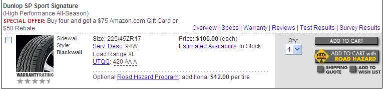 Here are two options I'm considering. If I get the Dunlops, I'd get the $75 Amazon card, I think and Alex said Mr. Hubcap will mount tires for $50 if I mention Alex, the Rally Driver.