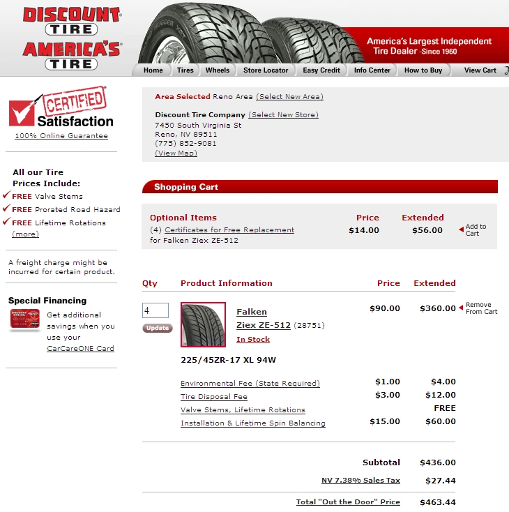The best deal I have seen on tires is for the tires that I have on my car right now. The Kuhmo Ecsta AST. Although the tires aren't exactly good for anything other than a DD, the price cant be beaten. $54 each. Making the total $231.93 (.225/40/18.)