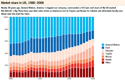GM used to have 50% U.S. market share. In the '70s, the big three had 80%+, now it is half that. They failed to recognize the change in consumer wishes and kept trying to market the same old thing, or worse, the new thing that is way off the mark. This graph is pretty interesting. It really shows them just failing to compete. No amount of "baseball, Hot Dogs, Apple Pie and Chevrolet" patriotism marketing can/could save them. They became uncompetitive both from a product and a cost perspective. You can't compete when you are paying the guy bolting seats into a car $70K+ including benefits...  People bitch about Wall St. wages, but most are proportional to the amount the employee brings to the bottom line. In the auto industry, the exceptional wages and benefits actually take away from the bottom line and profitability of the company... It will be very interesting now that the UAW owns a chunk of GM and Chrysler how they reconcile wages and the companies ongoing existence.