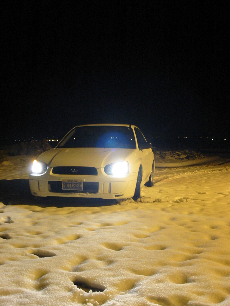 And today it was covered in snow, as were all the connected parking lots. Having never driven an AWD car in the snow before (aside from out to work and back today), I resolved to find out what my RS and a set of re92s could do. Scoobnuts, of course! But I was surprised by the level of traction the car afforded, even on the stock rubber. It took work to get it to break loose, and even when it did, it was always back on track almost immediately. The only real problem I ran into was the tendency for ice to pack in to the front wheel wells as I was sliding around, effectively reducing my steering capability to about 20%. Nothing a bit of digging around behind the wheels can't fix, but something I'll definitely be keeping in mind the next time I have to drive a moderate distance in heavier snow. I also took the opportunity to snap some decent night-time shots, something I had been meaning to do since getting my coilovers and SECCS decals.