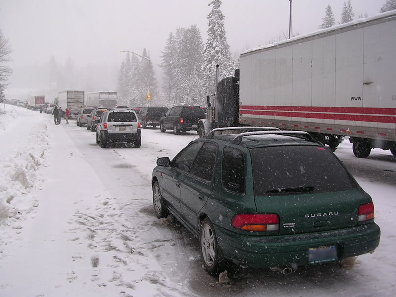 It's all fun and games until the rain starts to gel --- within minutes I get to the lines of stopped traffic. Good way to kill half an hour, I think --- and turn on the tunes. No problem, I'll just wait this out, skate by the chain control, and slalom my way past the minivans to the summit. Then finally I see the real cause of the backup --- not the chain control checkpoint itself, but the scads of freaking tourists frantically fighting for a piece of the chain-monkey pie. Obviously the same merging skills I see displayed on freeway onramps get raised to some unGodly power when slick sh$t is involved. 30 minutes for this? I start to get a feeling that a mistake has been made somewhere. I grin at the chain checker as he waves me by, and head up the hill. To my dismay, I notice that the same dudes are waving the SUV's through in droves. Wait, shouldn't a lowered Suburban with 14" wide street tires and no chains on throw a red flag in SOMEBODY'S mind? Wonderful. I start trying to dodge the full-sized pickups spinning their rear chains and become aware that I can see cell phones in use simultaneously. Suddenly my sleeping bag and some parking lot by a Citrus Heights Walgreens is starting to sound attractive........but too late, missed another exit. I'll just perservere. The bad part is behind me. Glaring brake lights drown out my Johnny A. CD, and pretty soon I'm stopped in another never-ending line of people that anywhere else I'd pay money to avoid. No escape. I shut off the engine and get out while the snowstorm doubles its effort. A chat with the trucker next door yields precious little information, and I resign myself to my fate. A semi tow truck offroads by through the drifts on the shoulder, and I start looking for a nice, flat campsite. Another 30min later, and just when I figure I've cleaned my headlights for the 20th time, suddenly traffic is moving again. No sign of the wreck, or stuck big-rig. Things stay congested and psycho as the thundering herd catches up with three Cal-Trans plows, and one in four drivers gets cold feet on the pass, but for some reason refuses to reliquish the coveted #1 lane. Ego problems combined with despicable cowerdice is the worst personality combination this side of Bill Lumbergh. Aren't chains supposed to be like liquid courage? I stay in the #1 lane, along with the majority, as we try to ease past the obstacles. Things get complicated when suddenly the #2 lane is filled with idiots roaring up from behind, tailing the plow, and then slipping into spaces that were too small to begin with. This is what pissed me off the most, as it was repeated time and again the whole way to Bordertown. You can't tighten up and refuse them entry, as otherwise you've just reduced your stopping space to negative zero --- so you just have to back off and let the jack-asses play their little game. Just as we get back to Ludicrous Spee.......I mean, 30mph, we reach another choke point --- this time on a hill. To my never-ending delight, I see a repeat-offender Mazda Tribute SUV full of snow-bunny wannabes spinning it's front tires without success while trying to get started again! I let the other folks manuver around the idiot-machine (in the #1 lane, of course), and stop a little ways behind the ignoramous-school dropouts. When I get out I see the chains. They're on the rears alright, but it's the fronts that are still spinning their way to China! As I'm walking up the slippery road, the pilot of a passing Jeep Cherokee loaded with another set of Gucchi 'boarder geniuses yells out, "Hey, they put them on the wrong ones! Aaahhhhahahah!". My reply as I step up to the Mazda? "Yeah, I thought these SUVS were supposed to be useful!" But he can't retort, as the flow of impatient travelers has conveniently swept him beyond vocal range. I get some nasty looks though, and not just from one car. It's nice to be heard. The Mazda driver's ghey snow-dingle-cap is obnoxiously close to my face as he rolls down the window. I get right to the point, "Is this thing four-wheel-drive?" "Uhhhh...no, it's just two-wheel," he says. "Pull over an put 'em on the fronts, dude, they ain't helping you there. It's your front tires spinning!" Dude: "Uhhhh....I can't, I'm stuck..." Incredulous. "Can you back that thing?" Dude: "Oh....." I walk back to the Subie, which doesn't spin at all on lift-off. As his chick is out helping him pry the ice off the chains (as they get square on half the #1 shoulder), I yell out the window --- "You might want to put your hazards on!" Chick:"Oh, okay!". I figure on an uphill even the cell-phone sledders might stop in time. Another 20min check at Soda Springs, another tow-truck driveby, and we're off again. Repeat the plow-passing scenario 3 more times on the downhill. Near the Prosser Road exit, a minivan full of English-second-language individuals suddenly pulls to the left shoulder (half in the #1 lane), and proceeds to unload. Some start throwing snow at one another, and some start removing chains, inexplicably. As I figure it's only a matter of minutes before one oblivious incompetant takes out another, I tap the horn as I shoot the narrows at 40mph. Half a mile later, I pass a perfectly open chain removal area. What the heck is with people? One BMW-SUV-driving blue-hair takes up the #1 lane for a few miles below the Truckee scales. I'm pondering what to do when I see a 4Runner flying along the #1 shoulder, so I give them some room as I like my mirrors where they are. They are Tahoe locals for sure. They practically tap the BMW's glass with the middle finger as they sled by, and soon after I manage to get around the Beemer in the #2. As we hit wet asphalt just before Bordertown, I notice that some of the same crazy tailgating lifted-pickup drivers who tried to kill me in the beginning survived the ordeal, and didn't gain a whole lot. I resist the urge to expend my remaining ammunition on their balloon tires. Whoa, I guess a 6.5 hour journey that should have taken 