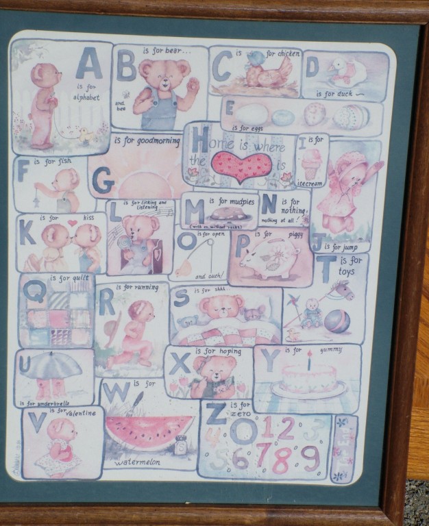 Picture of Alphabet picture as well as headboard and lounge pillow.