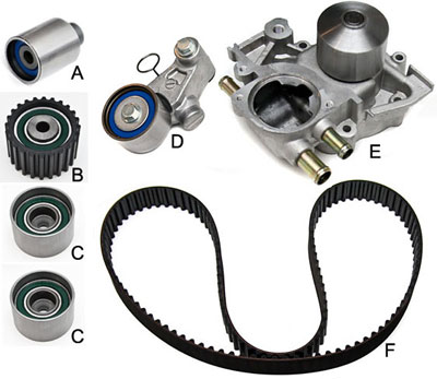 Gates complete Timing Belt Replacement Kit - includes OEM-quality timing belt, water pump, and all idlers and tensioner shown below.