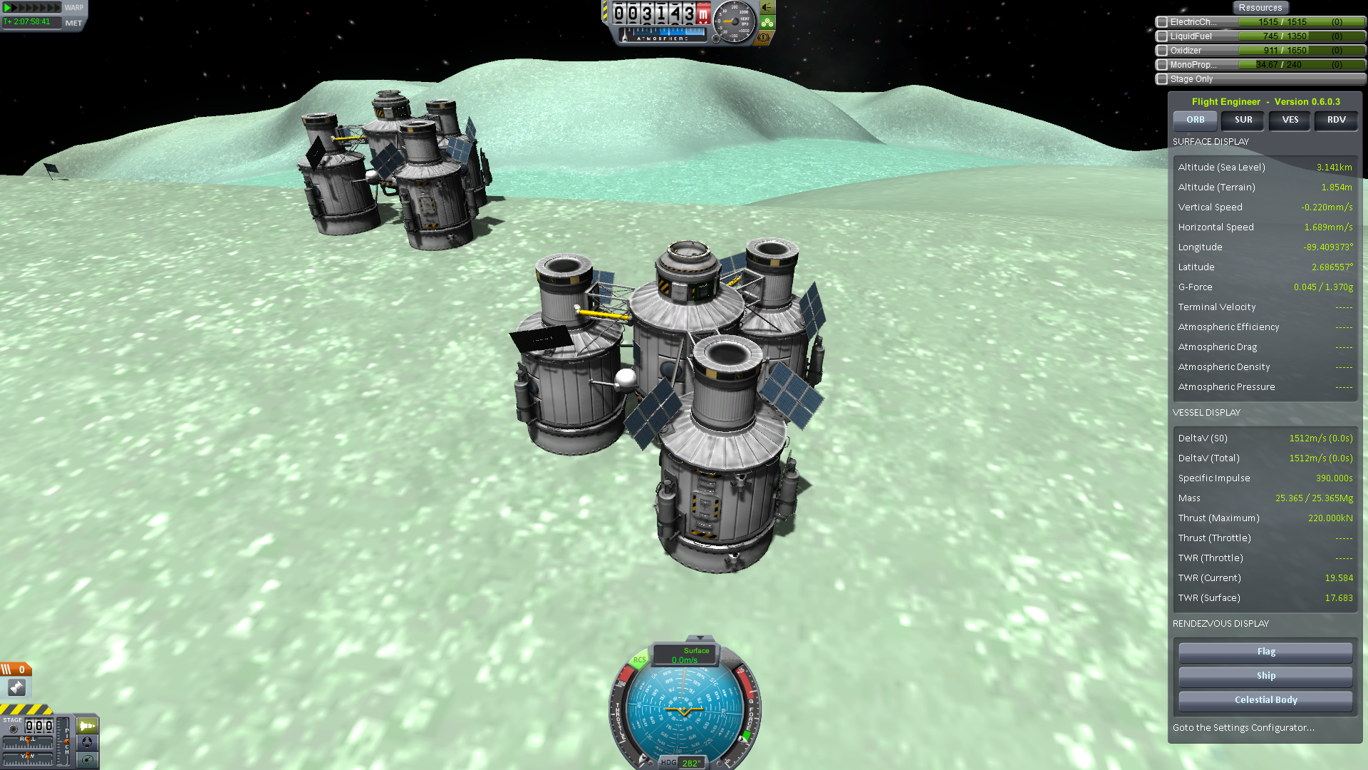 I decided to abandon the Mun landing site and instead establish a settlement on Minmus. LunarBase-1 is currently under construction. Landed two unmanned habitats ahead of the Kerbonauts that will be coming soon in their own ships.