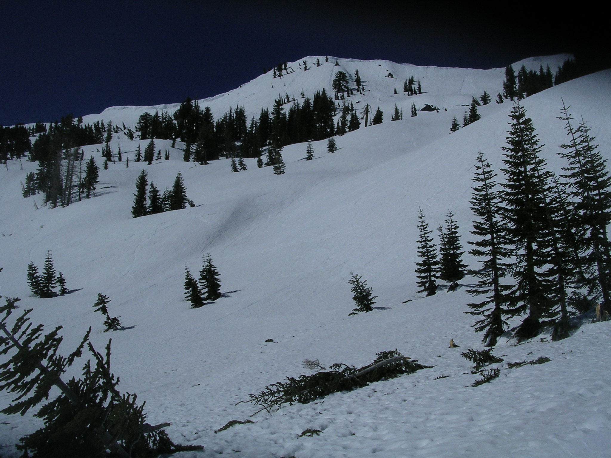 This is actually my favorite time of year to ski. The steeps are especially fun. Those trees were snapped like twigs from an avalanche earlier in the season. |