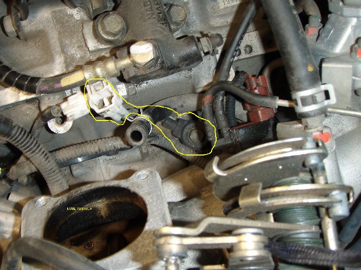 Ok Im gaining conficence. I folded the throttle body out of the way to gain access to the connector. Yes its under the throttle body pullies, behind the intake manifold, right of center on the top of the block. You can see the hydraulic clutch to the rear.