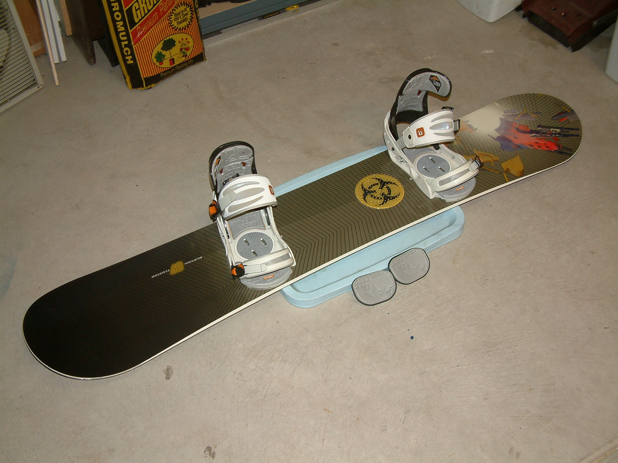 The board's a 2002 Burton Floater 167. It's a great free-ride board for tall people w/ big feet. The board is damn near new. I think it's been ridden like 8 times, all in good snow, so no rock damage or anything. Plus, I totally suck at snowboarding, so it's not like I've been jumping it off anything or sliding rails. The board has some nice Burton bindings as well, but I can't remember the name of 'em. The bindings have both the wrap-around pads (installed) and the regular ones (on the floor in the pics). I'm looking for $250 for the board+bindings. I'd rather not split them up. The price is negotiable, since I really don't know how much this stuff's worth. I know I paid about $550 for the board, bindings, and boots (already sold), so the board was about $350 new.