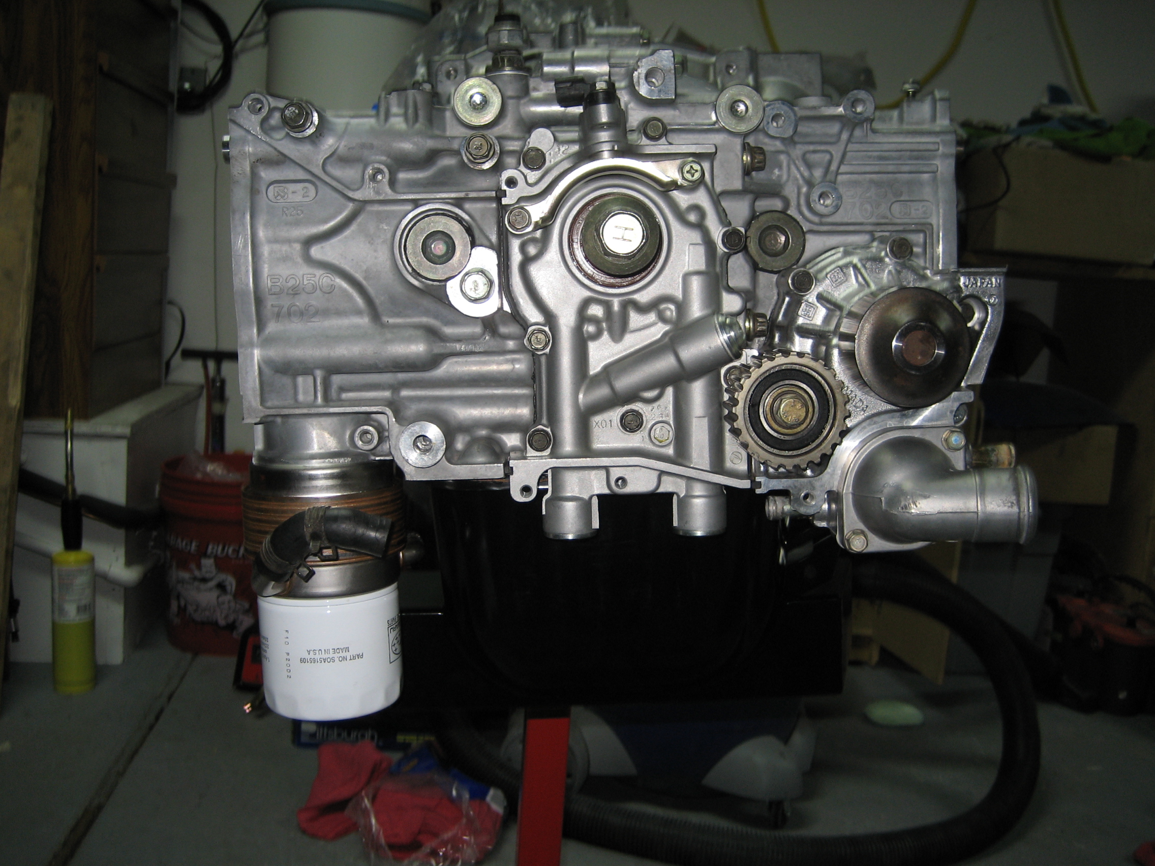 So, I'm finally making progress in the right direction. Put all the plugs into the shortblock, installed the oil pump, water pump (12mm JDP pump that I added a shim to for a bump in oil pressure), cosworth oil baffle and oil pan, oil/water heat exchanger, and did some basic cleanup.