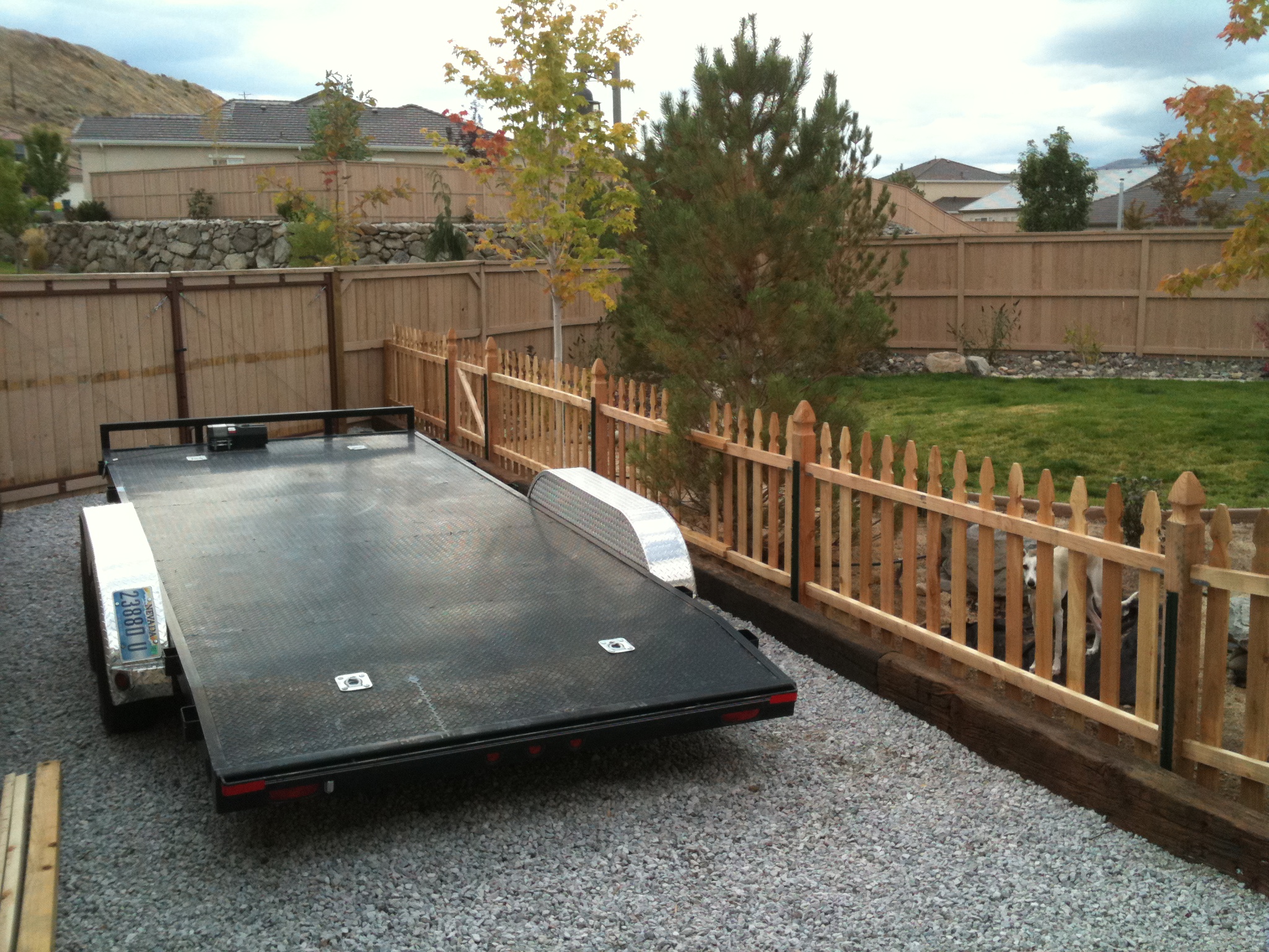 I *finally* finished up that gate/trailer parking area (well, aside from painting) last weekend. The gate itself was done weeks ago... then I finally got around to tearing down the old fence and moving the panels to the new posts... then another delay before the landscapers came out and put in the gravel and railroad ties. Then my dumb dog decides he likes to rub his head in the railroad tie tar, so I had to put in *another* smaller picket fence to partition out the trailer area from the rest of the yard.