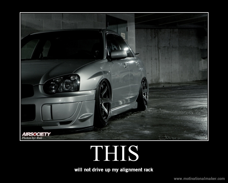 However, since I'm pretty damn low with a set of wheels on the way that will require fender mods, camber, and mild stretch to fit; it's not an epic build, high horsepower car, Forester, leggy, wagon, lifted, track car, and I'm not a lady, this is where I fit.