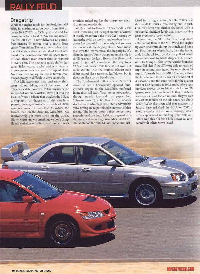New article about the '05 STi and the new EVO VIII MR. I didn't realize the STI's lost so much power from the engine to the wheels, the EVO actually makes more HP to the wheels than the STI. Good article...