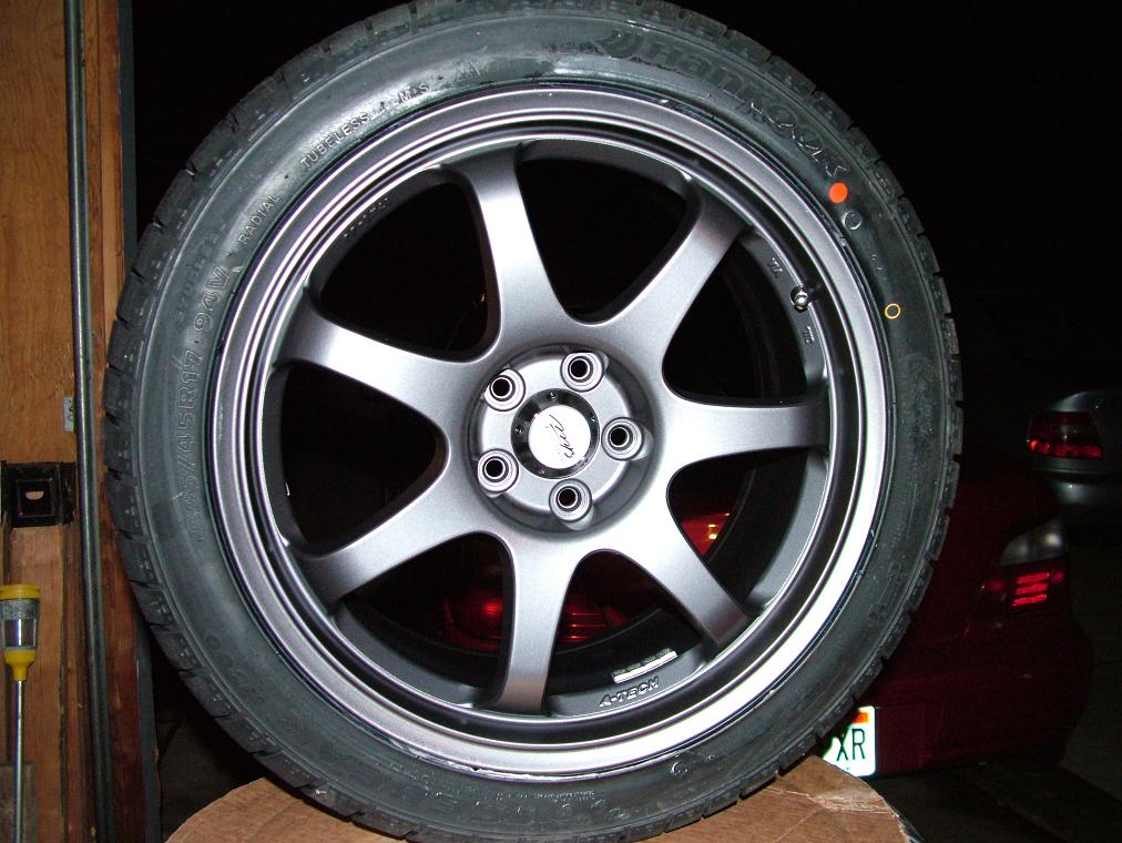 Update... A search on Nasioc shows that they are actually A-Tech/Final Speed "Erasers"... JDM Yo... 18.5 lbs according to some guy's bathroom scale... And the wheels do have the A-Tech logo...
