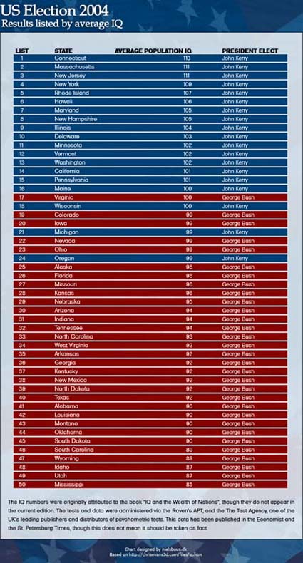 Haha, I find it difficult to believe that CA, CT, and MA all have average IQ's over 100. I wonder if IQ tests are biased towards one type of intelligence or not.....of course, this could start up a whole row about why University populations are more liberal --- as any of you that have attended college knows, student of "higher learning" aren't always (usually?) the most capable people in the world..... :?