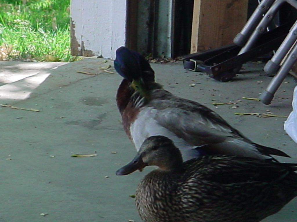 So apparently, our cul-de-sac has been adopted by a pair of ducks as a new home. They hang out on our lawns, bathe in the sprinklers, and generally act like they belong here. today, while I was getting ready to wash my car, they even walked into the garage and looked at me kind of expectantly. So I fed them some Tostitos. We didn't have any bread.