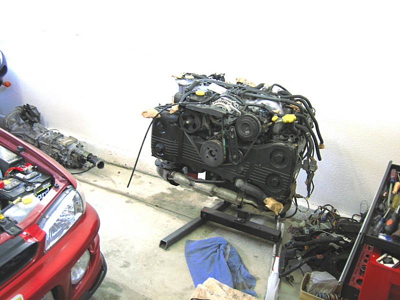 2000 rs, red (like dean's car) coupe, super clean. EJ257 short block with single cam heads, stand alone EM, FMIC, Fuel rails and injectors are changed, (dunno what brand) Airflow research turbo swap, (stamped "AR06" on the housing) coil-overs, (appear to be GC's) 5-zigen rims, full exhaust.