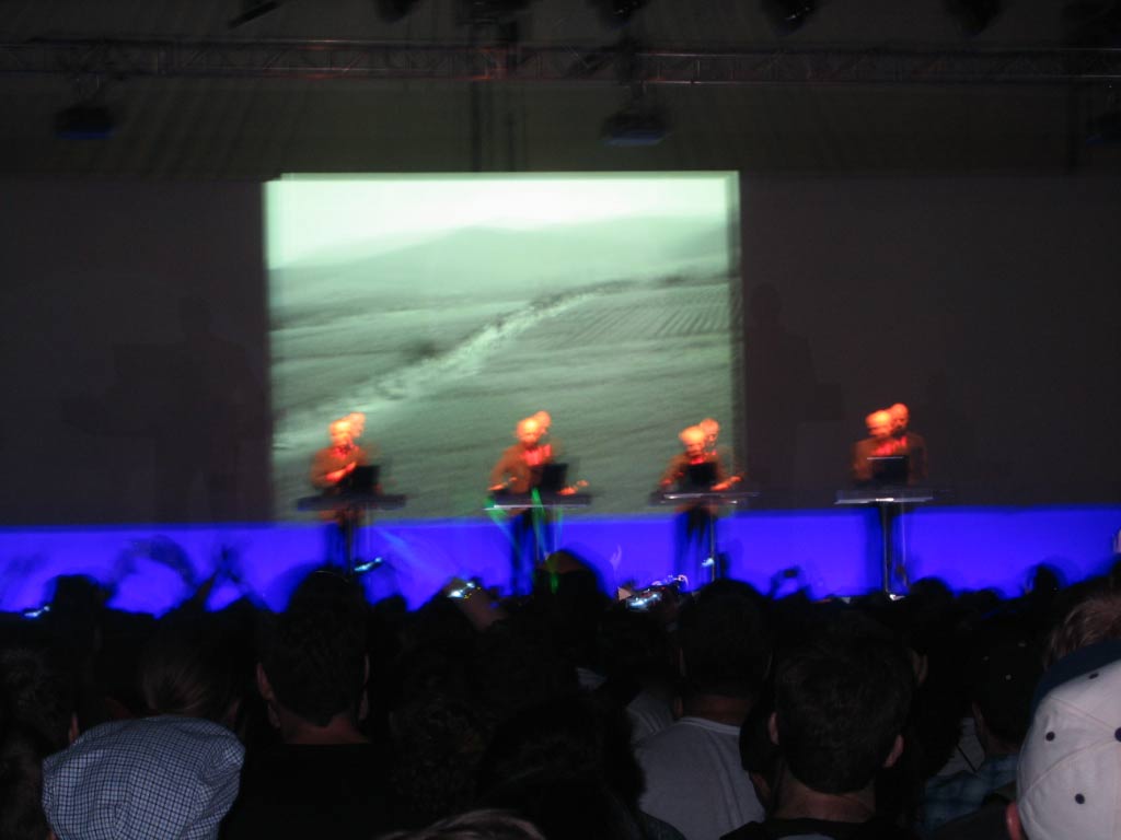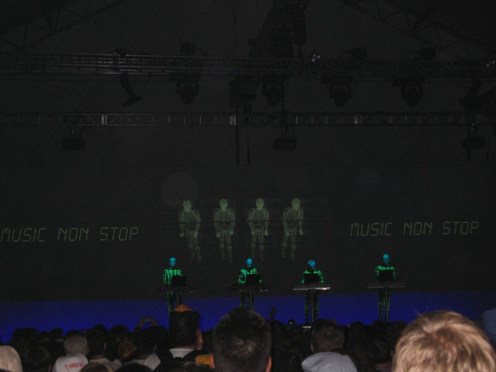 The Kraftwerk show was extremely cool. The guys were not directly wired to the images behind them but they could control them at their whim. The projector screen was large and the images were very high quality if you can tell from the pictures The Kraftwerk show went as follows: