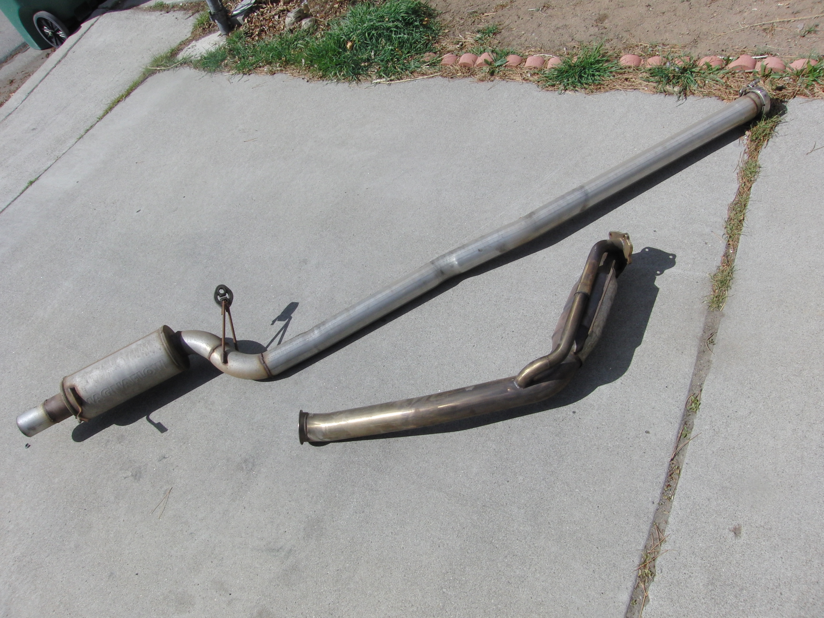 Mandrel bent (except two slight bends in the midpipe) full stainless, catted downpipe with divorced wastegate flange and Magnaflow muffler. The best part is that it has only 2 pieces connected by a v-band clamp- no gaskets to change when you install/remove it except the one to the turbo. Made by the same guy who used to do the Vishnu Signature Series exhausts. Asking $600 for the locals.